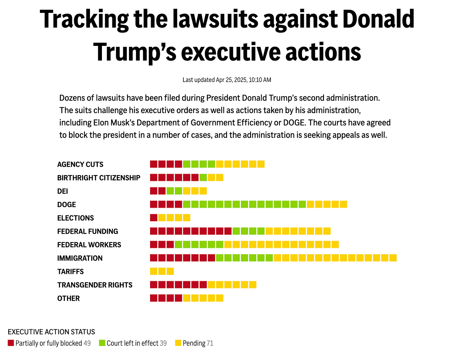 It seems right now that the Trump administration has to spend a lot of time prepping for these cases. 71 pending (so far!) is a lot to juggle, even for someone with the experience of being part of over 3,500 suits.