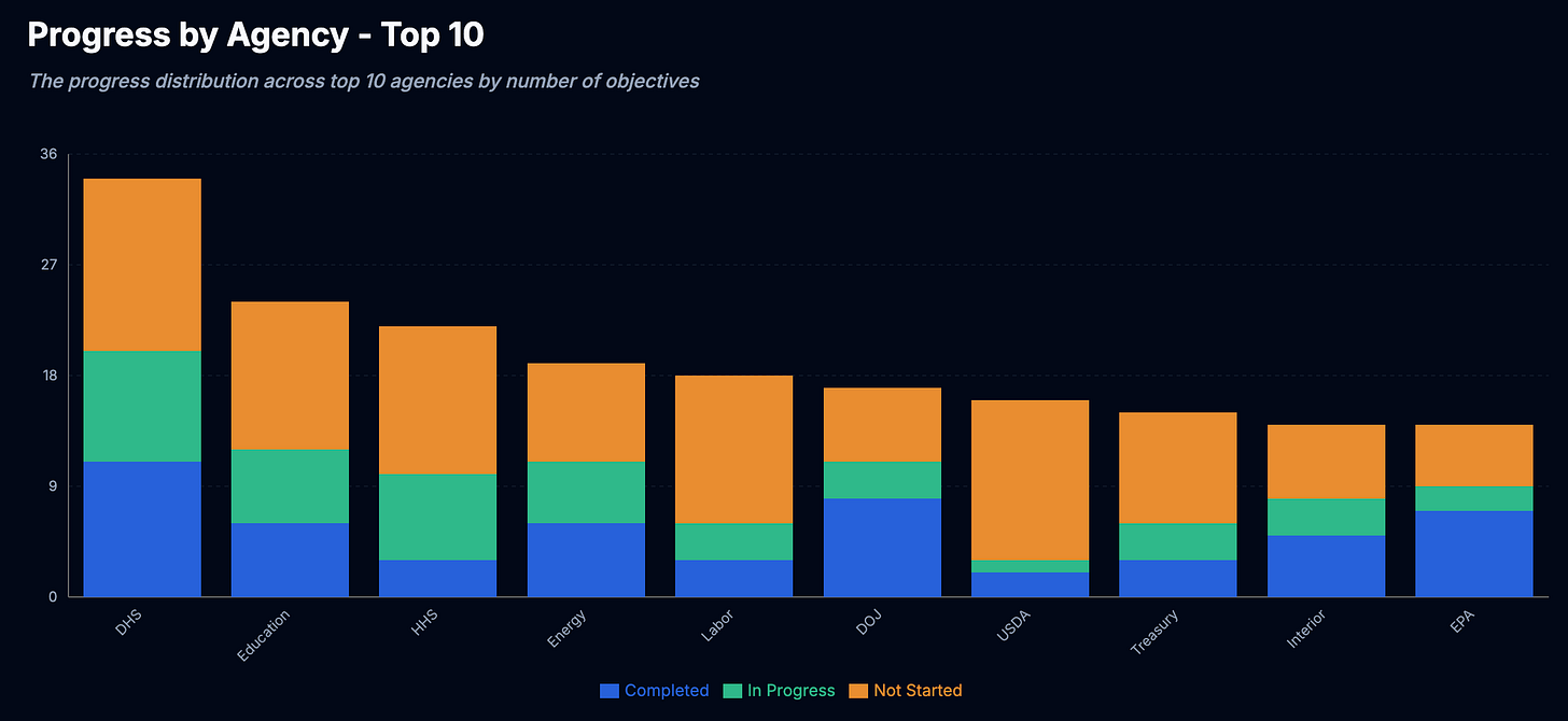 The graph while only showing us the top 10 agencies has an interesting data point — The USDA is the furthest behind out of the bunch. Digging into the data a bit more I found the FDA and CMS haven’t completed any of their goals and the department of Agriculture is very far behind others. Is it possible that the health of people is not in this administration’s top priorities?